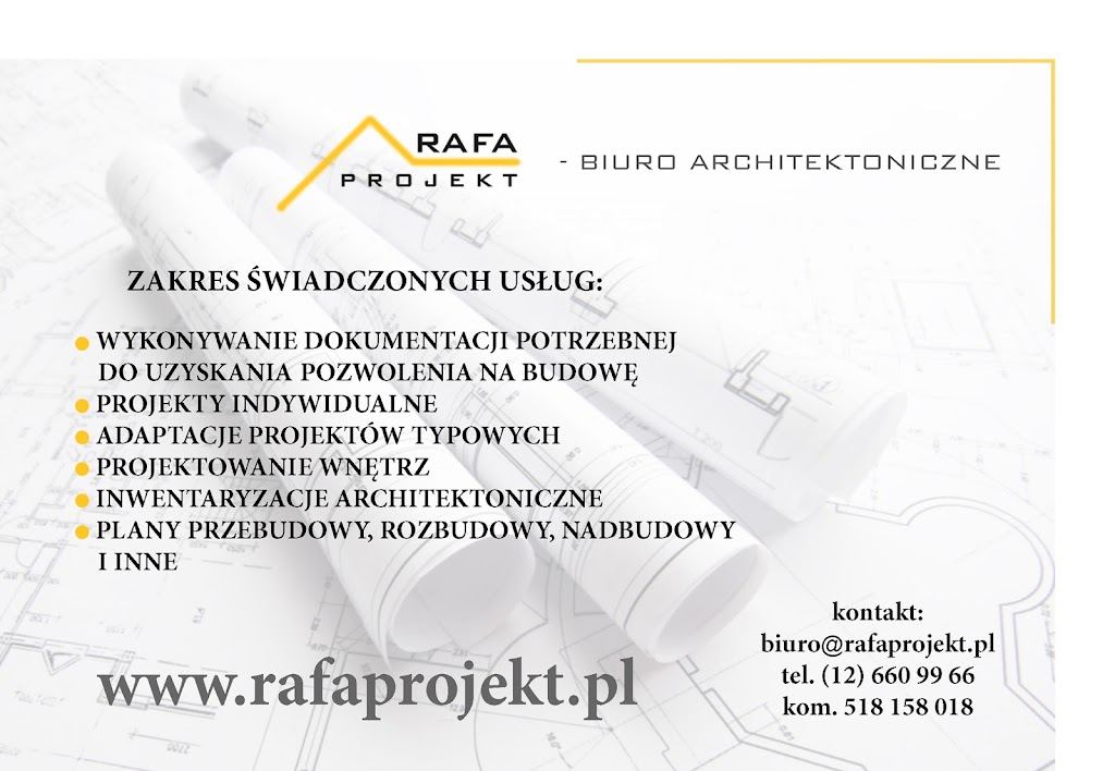 Rafa Projekt na ul. Prof. Władysława Szafera w Krakowie to solidny wybór, gdy potrzebujesz architekta, który ogarnia zarówno projekt, jak i formalności. Współpraca z arch. Jerzym Rafą jest opisywana jako wzorowa: rzetelna, terminowa i prowadzona w sposób bardzo konkretny. Klienci doceniają, że adaptacja projektu budowlanego wraz z pełną dokumentacją jest realizowana profesjonalnie, z wyczuciem detali i realnych potrzeb inwestora.